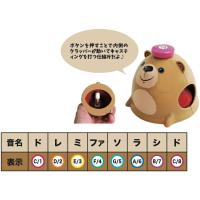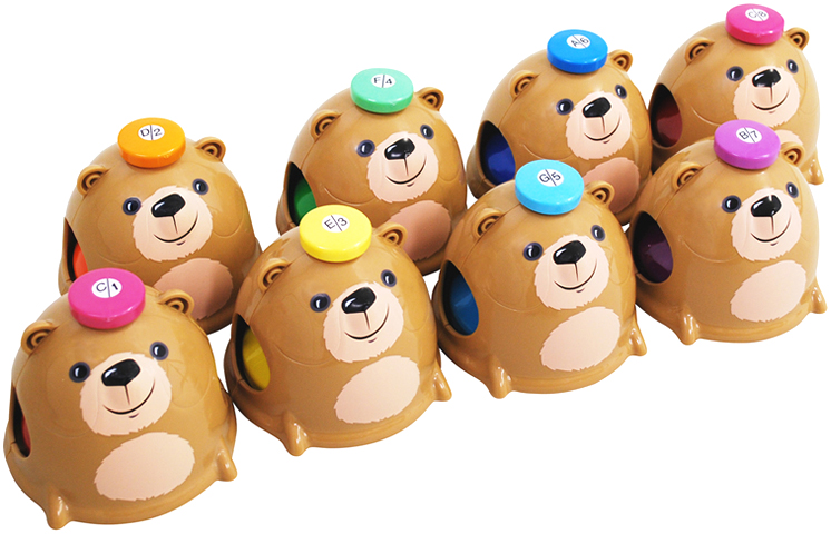 ボタンを押すことで内側のクラッパーが動いてキャスティングを打つ仕組み。外側のキャスティング部分のさらに外側はクマさんで覆われていますが、サイドに穴があいており、指が入るようになっていますので、直接キャスティング(ベルの外側)に触れることができます。若干難しい奏法にはなりますが、ミュートといって意図的に音を止める奏法ができるようになっています。子ども用のように見えますが、使い方としてはなかなか楽しい使い方ができそうな楽器でもあります。ボタンの色で音階が異なるため色で音を覚えて演奏もできます。初心者にはありがたいですね。