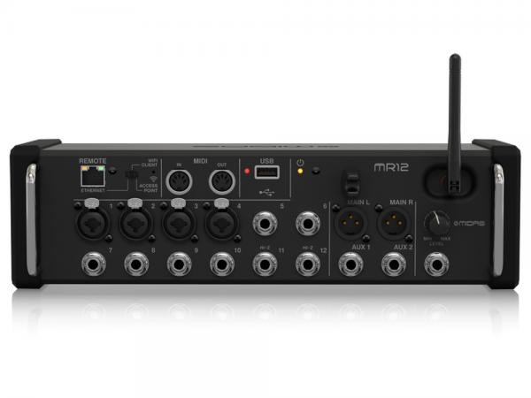 MR12は、12chのポータブルミキサーで、iPadとAndroidで操作をするステージボックスタイプ(ラックマウント可能)です。4つの Midas プリアンプ、ワイヤレスコントロール用のWifiモジュール、MIDI I/O、ファイル保存と非圧縮ステレオWAVファイルの録音/再生用のUSBコネクターを備えており、ライブとスタジオアプリケーションに理想的なツール です。