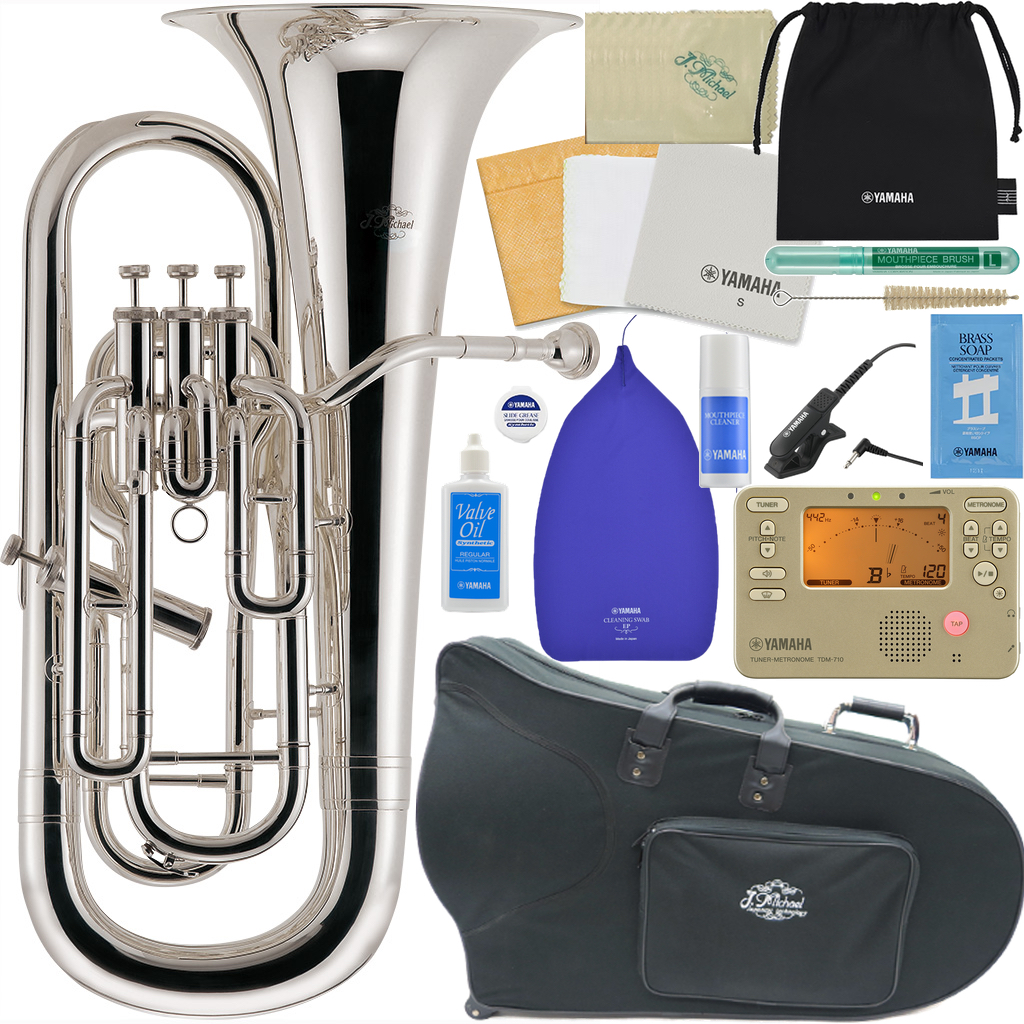 ピストン式、第4バルブは左手操作のサイドアクション。演奏性が良いと人気の商品です。柔らかい音色が人気のユーフォですが、シルバー メッキはゴールドカラーに比べて塗装の違いからやや落ち着きのある音色になります。楽器自体の特性が直接表れ、よりきめ細かなニュアンスが表現できるのはシルバーならではではないでしょうか。マウスピースは太管です。専門のメーカーのものに替えたりすることで吹き心地や音色もかわり、そこもまた楽しいものです。ソロ楽器としても魅力のある楽器。ご自分に合ったセッティングを追求してみてください。シルバー メッキは雑誌「ブラストライブ」にも掲載され、銀 メッキでありながらこの価格でこのコストパフォーマンスの良さが一躍話題となりました。誕生日、クリスマス、バレンタイン、入学 進学 のお祝い、贈り物、プレゼントにも喜ばれますよ。
