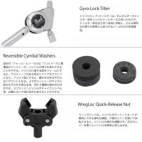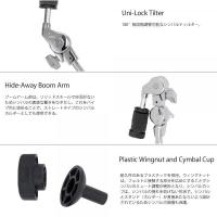 ブームアームをパイプ内に収納することでストレートタイプにすることもできるシンバルホルダー。ブームアーム部を通常の長さより約半分短くすることで、セッティングスペースの縮小を図り、180°無段階で固定できるユニロック・ティルターを採用することで、ギア式では不可能なシンバルの微妙な角度調整が可能。