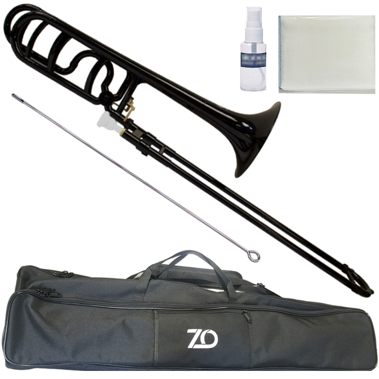 上記テナートロンボーンに、主にF管を取り付けたものです。テナーはB♭管ですが、レバーでF管に切り替えられます。これによって低音域が拡大し、遠くに 腕を伸ばさなくても同じ音程が出るしくみです。操作性が向上しますので早いパッセの曲を演奏する場合や体格や経験によってこちらを選ぶ場合があります。た だし、管が増えますので楽器が重くなります。こちらのトロンボーンがこのテナーバスになります。