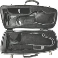 強度がある分重たいものがほとんど。中身は楽器の形にくり抜かれていてそのまま楽器を収納するタイプ。木管楽器(クラリネット/フルートなど)で持ち手がないケースの場合にはケースカバーをつけて持ち運びすることになります。