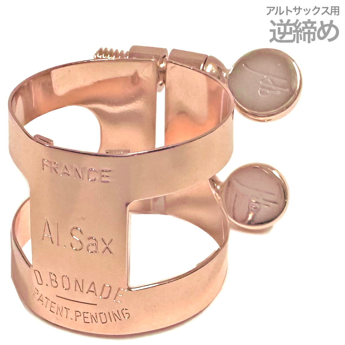リガチャーの素材は、大まかに分けて金属製と革製が多いです。素材によって演奏するときの音色や吹奏感がかわります。ボナードは金属製です。