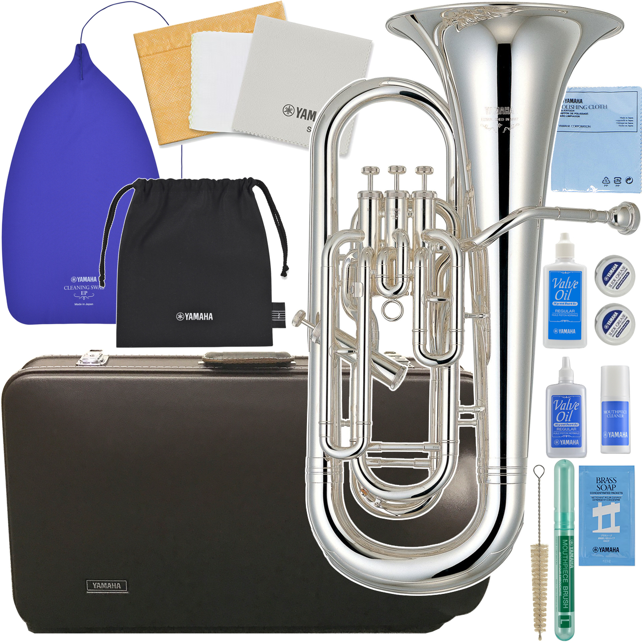 管体はイエローブラス。仕上げは2種類あり、輝かしく明るくはっきりとした響きが特徴のゴールドと、より表現豊かに微妙なニュアンスが表現できるこちらのシルバー。吹奏楽でのユーフォはシルバーが主流です。ゴールドラッカーよりお値段は高くなり、放置すればメッキがくもりますので、お手入れにはより気を遣う必要があります。ヤマハ管楽器はゴールド、シルバーと各仕上げでラインナップがある場合が多いですが、楽器によってシルバーが好まれるなど例外もあり、全ての製品で両方のラインナップがあるというわけではありません。こちらのモデルも銀メッキのみのラインナップです。