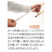 基本的にプラスチック管の楽器は必要最低限のオイルなどの類を使用しない方が良いのでお手入れは比較的楽になります。クリームなどはプラスチックに反応するとあまりよくありません。演奏時はウォータースプレーでスライド部分に十分に水を吹き付けます。「ウォータースプレー」はヤマハなどから出ておりますが、いわゆる霧吹きみたいなもので、中に水を入れて使用する容器です。 お手入れとしては、唾抜きから水分をしっかり取ること。管楽器はこれが一番大事なのです。またスライドがスムーズに動かないと感じた場合はクリーニング ロッド(お掃除棒 ヤマハ CRSLなど)にガーゼを巻いてスライド外管の中を綺麗にすると良いと思います。最初新しい状態では少し「シャリシャリ」という音がする場合がございますので弊社ではスライド部分を綺麗にして調整済みの商品をお送りしています。