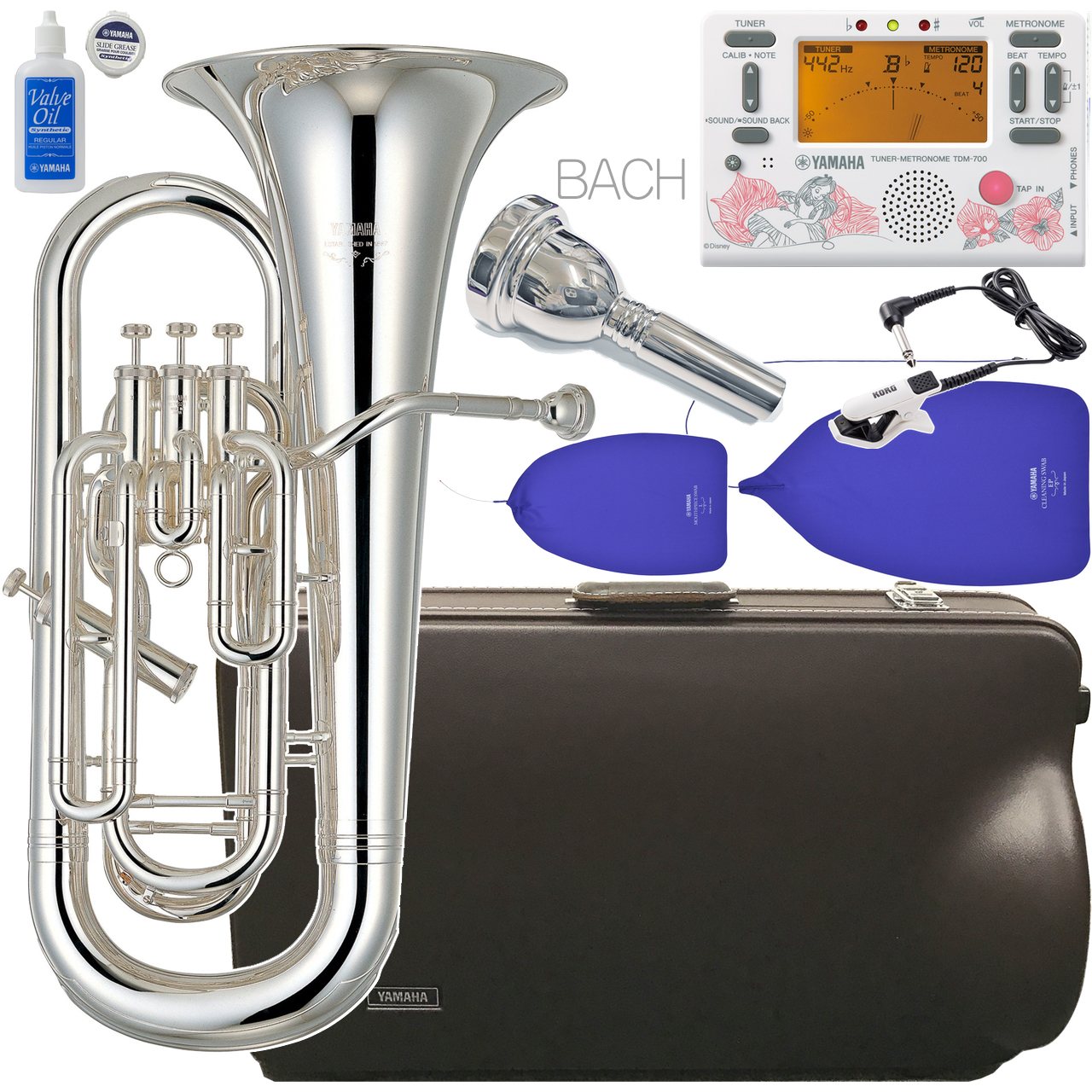 管体はイエローブラス。仕上げは2種類あり、輝かしく明るくはっきりとした響きが特徴のゴールドと、より表現豊かに微妙なニュアンスが表現できるこちらのシルバー。吹奏楽でのユーフォはシルバーが主流です。ゴールドラッカーよりお値段は高くなり、放置すればメッキがくもりますので、お手入れにはより気を遣う必要があります。ヤマハ管楽器はゴールド、シルバーと各仕上げでラインナップがある場合が多いですが、楽器によってシルバーが好まれるなど例外もあり、全ての製品で両方のラインナップがあるというわけではありません。こちらのモデルも銀メッキのみのラインナップです。