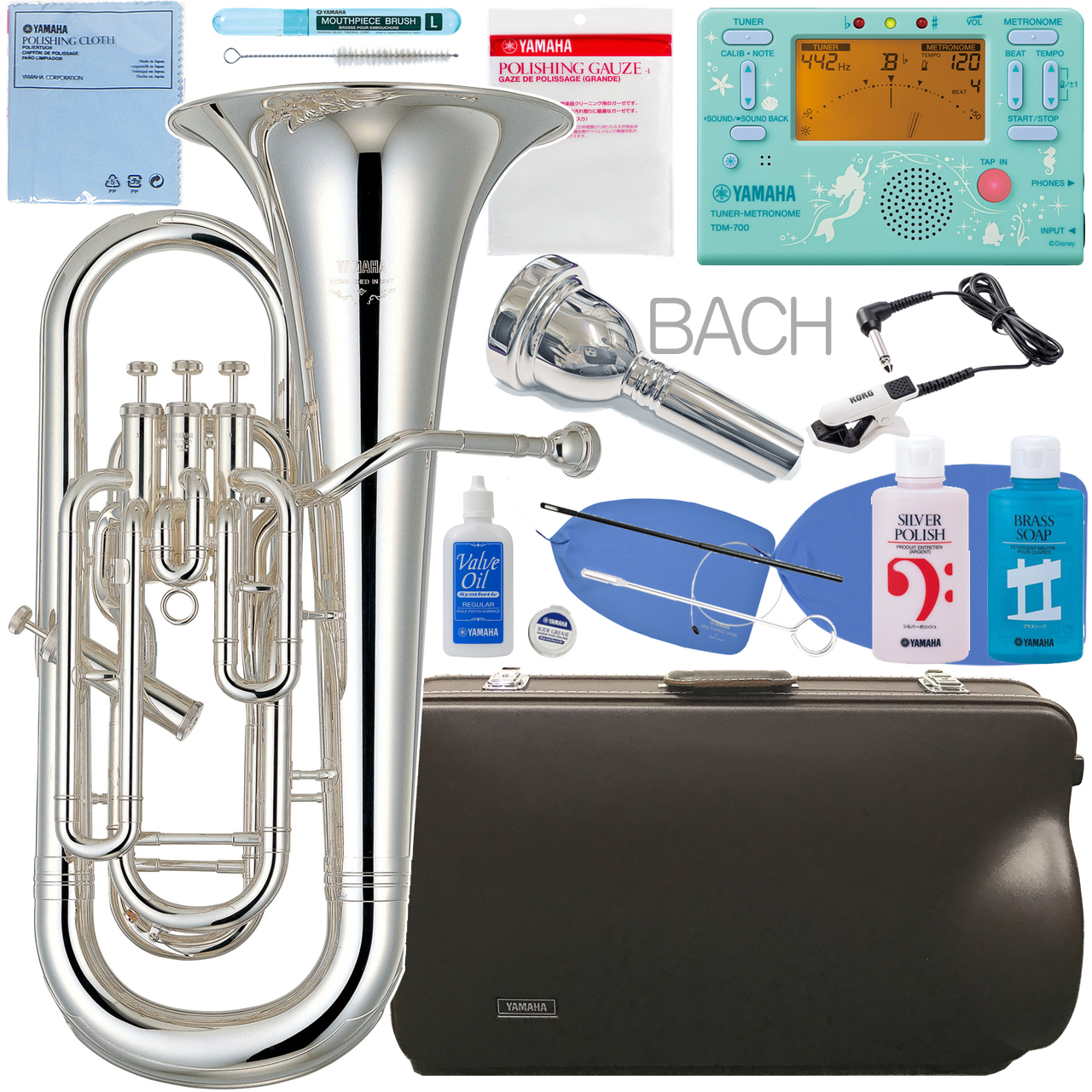 管体はイエローブラス。仕上げは2種類あり、輝かしく明るくはっきりとした響きが特徴のゴールドと、より表現豊かに微妙なニュアンスが表現できるこちらのシルバー。吹奏楽でのユーフォはシルバーが主流です。ゴールドラッカーよりお値段は高くなり、放置すればメッキがくもりますので、お手入れにはより気を遣う必要があります。ヤマハ管楽器はゴールド、シルバーと各仕上げでラインナップがある場合が多いですが、楽器によってシルバーが好まれるなど例外もあり、全ての製品で両方のラインナップがあるというわけではありません。こちらのモデルも銀メッキのみのラインナップです。