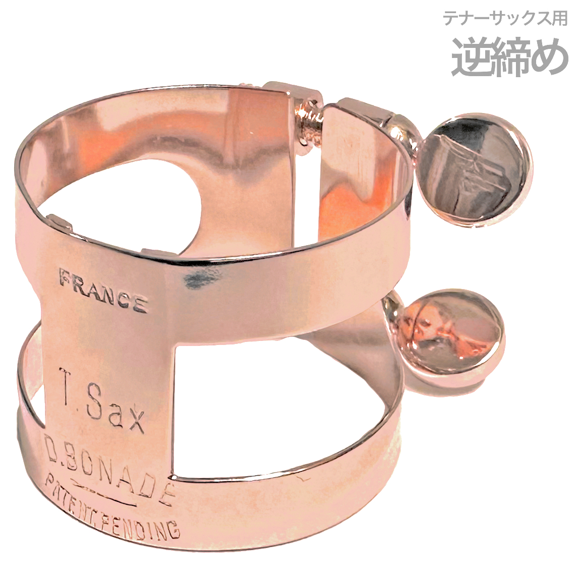 リガチャーの素材は、大まかに分けて金属製と革製が多いです。素材によって演奏するときの音色や吹奏感がかわります。ボナードは金属製です。