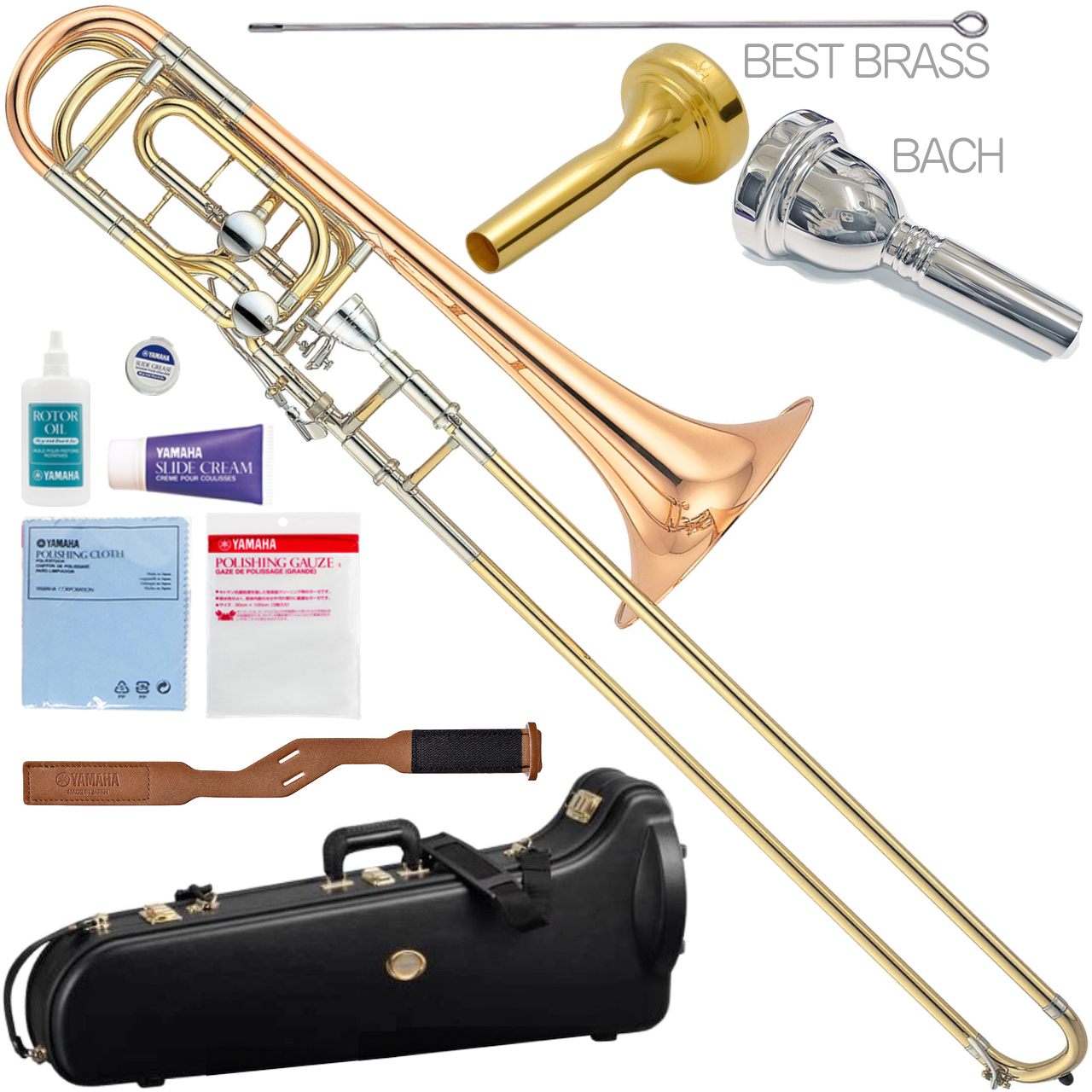 ・テナーバストロンボーン...上記テナートロンボーンに、主にF管を取り付けたもの。B♭管からレバーでF管に切り替えられます。これによって低音域が拡大し、出せる音が増えます。また6、7ポジションで出す音がF管を使用することで1番、2番ポジションで演奏することができます。操作性が向上しますので早いパッセージの曲を演奏する場合や体格、経験によってこちらを選ぶ場合があります。ただし、管が増えますので楽器が重くなります。