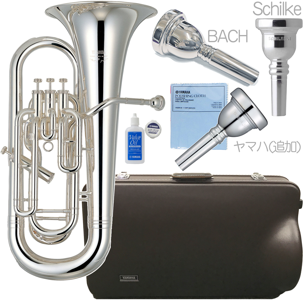管体はイエローブラス。仕上げは2種類あり、輝かしく明るくはっきりとした響きが特徴のゴールドと、より表現豊かに微妙なニュアンスが表現できるこちらのシルバー。吹奏楽でのユーフォはシルバーが主流です。ゴールドラッカーよりお値段は高くなり、放置すればメッキがくもりますので、お手入れにはより気を遣う必要があります。ヤマハ管楽器はゴールド、シルバーと各仕上げでラインナップがある場合が多いですが、楽器によってシルバーが好まれるなど例外もあり、全ての製品で両方のラインナップがあるというわけではありません。こちらのモデルも銀メッキのみのラインナップです。