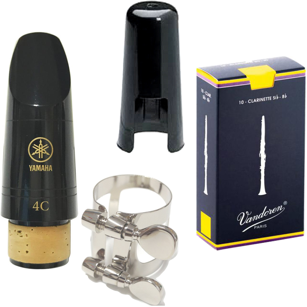 ヤマハ クラリネットマウスピース 4C+リガチャー+キャップ+バンドーレンのリード1箱10枚入りのセット。3番でお付けしますが、御希望あればご相談下さい。