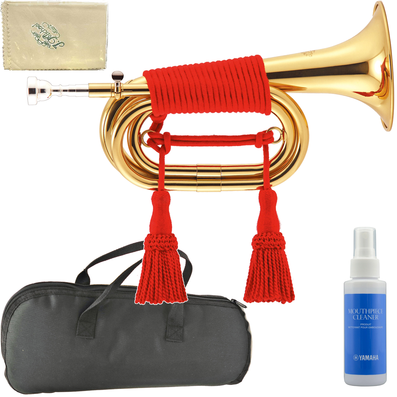 昔から色々なことに用いられてきた信号ラッパは懐かしい方もいるのではないでしょうか。 基本的には音楽を演奏する通常の楽器としてではなく、信号を周りに伝える道具として軍隊や消防団、自衛隊、などの合図などに使われています。ピストンなどの音程を変える箇所は付いていないため、出せる音は自然倍ド、ソ、ド、ミ、ソ、ドとなります。トランペットの何も押さえない状態と同じで、とてもシンプルな構造です。マウスピースだけで音階が全て出せるベテランの方にはとても色々な曲が演奏できるかもしれませんね。他の金管楽器と同じく、管を巻いて作られてあります。こちらは三回巻(三つ巻)で、ラインナップにはありませんが、他に二回巻(二つ巻)なども存在しており、大きくはこの2種が主流です。本体には紐(下げ緒)が巻いてあります。移動なども多い為、吊り紐としても使用されますが、他管楽器にはない装飾がきれいですね。マウスピースの装着方法は2つのラインナップがあり、こちらは通常の金管楽器と同じくストレートのマウスピースです。他、現場でマウスピースが抜け落ちることがないよう、シャンク部分がネジ式になっているものも別にございます。ご使用用途に合わせてお選び下さい。