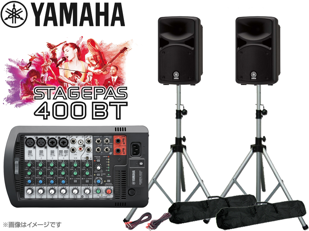 ポータブルPAシステムの定番 YAMAHA STAGEPAS(ステージパス)シリーズの400BTとライブやイベントでの安全で適正なスピーカー設置に必要なスピーカースタンドをセットし、お得な販売価格に致しました。