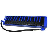 鍵盤ハーモニカは「ピアニカ」と呼ばれる事が多いと思いますが、「ピアニカ」とはYAMAHA (ヤマハ)の鍵盤ハーモニカの商品名となり、昔から学校などで推奨されることが多いことからその名前が広く使用されております。HOHNER (ホーナー)社から出ているものは「メロディカ」と呼ばれ、ヤマハがピンクと水色が定番であるのに対し、グリーンのカラーで親しまれております。そのメロディカよりオリジナリティ溢れた新カラーの登場です。白い鍵盤は黒になり、黒鍵が青色の配色になり、いつもの楽器がとてもオシャレに見えますね。最近ではバンドのボーカルさんが片手に持って合間に演奏したり、キーボード担当の人が路上ライブ用にご購入されていたりしており、楽曲に広く取り入れられているのではないでしょうか。吹き口は2種ついており、立って演奏する際にはホースの無いタイプ、机に置いて演奏される場合はホースが付いているものが適しています。保育園、幼稚園、学校教育の学販では必須のモデル(型番)で指定される学校もありますが、特に指定が無い場合は一般的な32鍵の鍵盤ハーモニカとしてお選び頂けると思います。