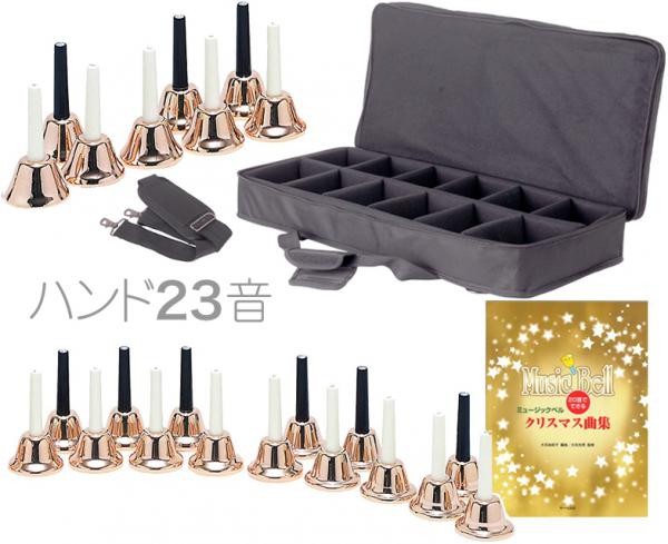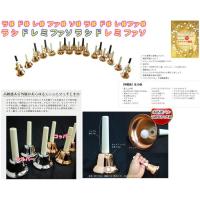 一番シンプルなハンドベルとしては、単音1本からご購入いただけるものもございますが、こちらのいわゆる大量生産品としてはセットの販売となります。何オクターブ必要か、シャープ音が要るのかどうかなど、どの音が必要なのか演奏される曲の音域によってベルを選びましょう。こちらは23音です。多い数であれば20音、23音が一般的です。少なければ1オクターブ8音なども他メーカーでございますね。(鈴木楽器、河合楽器、全音楽器など教育楽器メーカー)