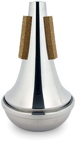 ストレートミュート:音色の変化を目的としたミュートではありますが、音色にあまり変化を与えずに音強を落とすことを目的として作られている。各社でたくさんの種類があり、材質も様々。一番スタンダードでよく使われるのがこれです。楽譜では「con sordino」(コン・ソルディーノ)、「with mute」などの演奏記号にて指示されています。ジャンルを問わず一番活躍。特に、スタッカートやアクセントをはっきり聴かせたい時など明るく歯切れの良いサウンドが欲しい場合にはこれ。
