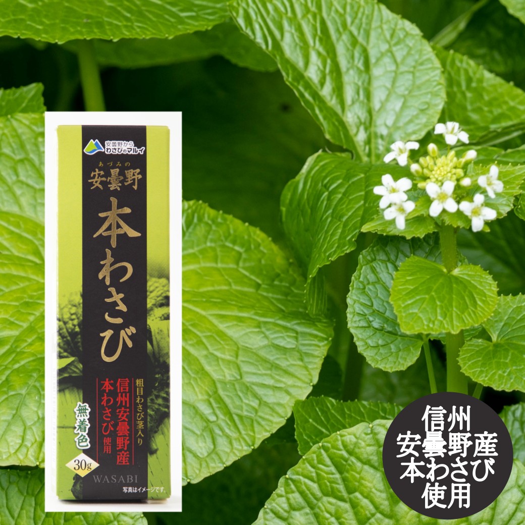 原材料: 塩蔵本わさび(本わさび(安曇野産)食塩)、食物油脂、食塩、デキストリン、本わさび(安曇野産)、食物繊維、本わさび加工品(安曇野産)/ソルビトール、加工デンプン、環状オリゴ糖、増粘剤(キサンタン)、香料、酸化防止剤(V.C)