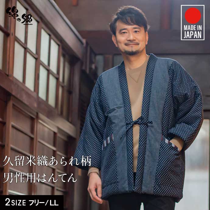 商品名:日本製 半纏 メンズ 久留米織 綿入れ 袢纏 半天 丹前 男性用 刺し子柄 あられ柄 はんてん おしゃれ 防寒 どてら 冬 ドビー織 あられ柄 フリーサイズ 夫婦 お揃い 男女ペア