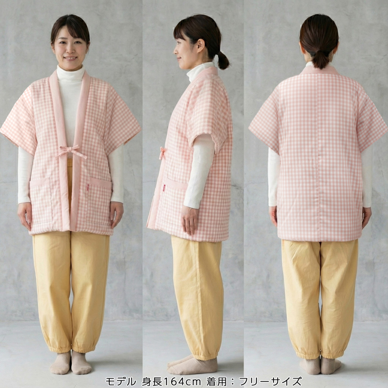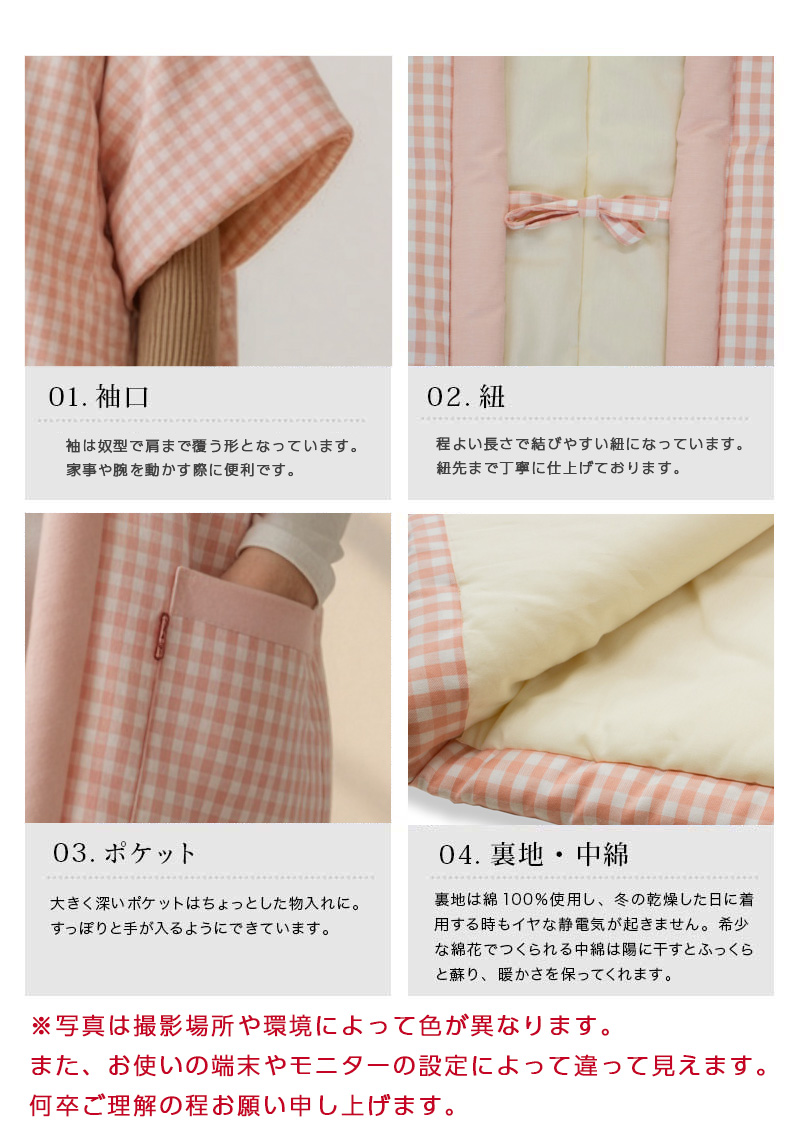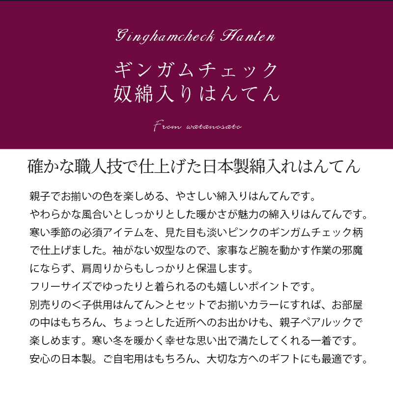 | 商品紹介 | 確かな職人技で仕上げた日本製綿入りはんてん 親子でお揃いの色を楽しめる、やさしい綿入りはんてんです。 やわらかな風合いとしっかりとした暖かさが魅力の綿入りはんてんです。 寒い季節の必須アイテムを、見た目も淡いピンクのギンガムチェック柄で仕上げました。 袖がない奴型なので、家事など腕を動かす作業の邪魔にならず、肩周りからもしっかりと保温します。 フリーサイズでゆったりと着られるのも嬉しいポイントです。 別売りの <子供用はんてん>とセットでお揃いカラーにすれば、お部屋の中はもちろん、ちょっとした近所へのお出かけも、親子ペアルックで楽しめます。 寒い冬を暖かく幸せな思い出で満たしてくれる一着です。 安心の日本製。ご自宅用はもちろん、大切な方へのギフトにも最適です。 |