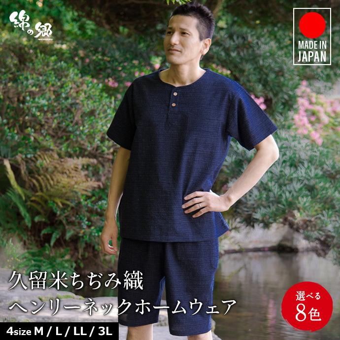 日本製 久留米織 甚平 じんべい ちぢみ織 ヘンリーネック ホームウエア ルーム メンズ おしゃれ 上下 セット 父の日 ギフト 綿100% プレゼント