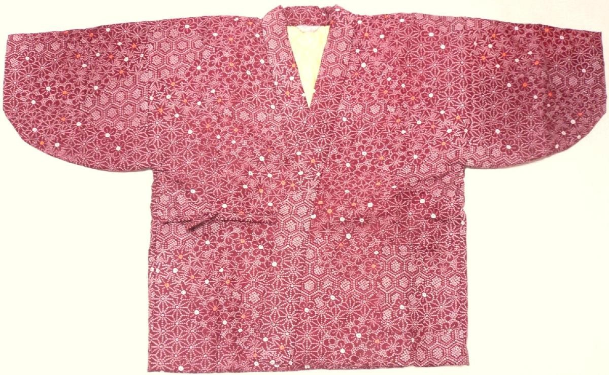 絞り柄なので、たいへんおしゃれなイメージの前合わせの半天です。前合わせなので、お腹の部分もしっかり暖かくなります。