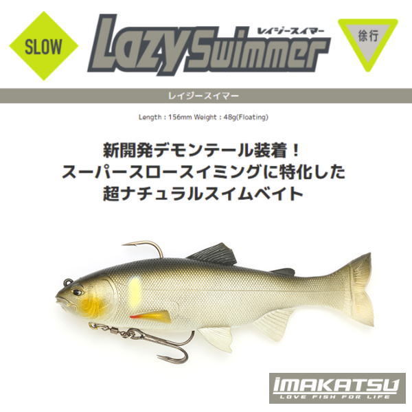 レイジースイマーはスローリトリーブでもデモンテールを左右に規則正しく振り子のように動かし、重量感のある水押しアクションを発生させるデッドスロー特化型ナチュラルスイムベイトです。インナーコアに浮力体が内蔵されており、0.6〜1.1gネイルシンカーでの微調整で完全水平姿勢をキープします。1年中どこでも効果を発揮しますが、特におすすめなのがプリ、アフター問わずスポーンと名がつく季節。ゆっくりと水面下を無警戒な魚を演出しながらリトリーブするのが有効です。ポイントはレイジースイマーのナチュラルさとレイジーさを際立たせるために、とにかくゆっくりとリトリーブすること。常にバスの目線より上で見せてやることで、より無警戒でレイジーなベイトフィッシュを演出することができます。Length : 156mm Weight : 48g(Floating)
