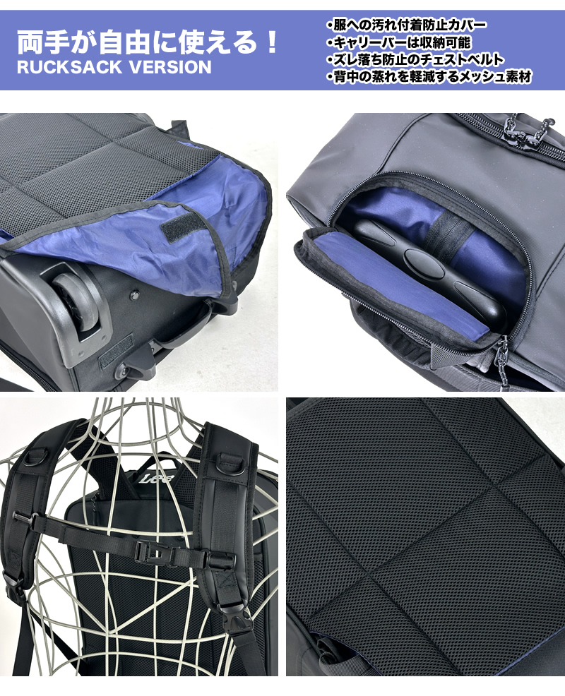 キャリーとリュックの2WAY仕様で用途に応じて使い分け可能。