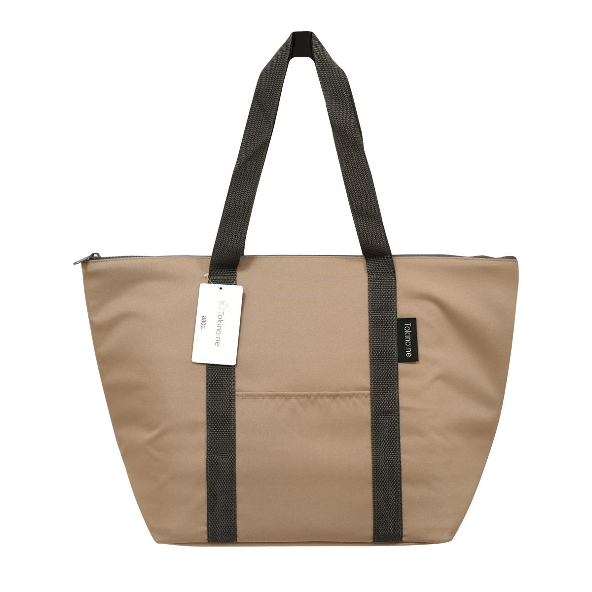 買い物やレジャーなどに使え、自転車カゴに入れやすいサイズのベージュカラーの保冷トートバッグです。