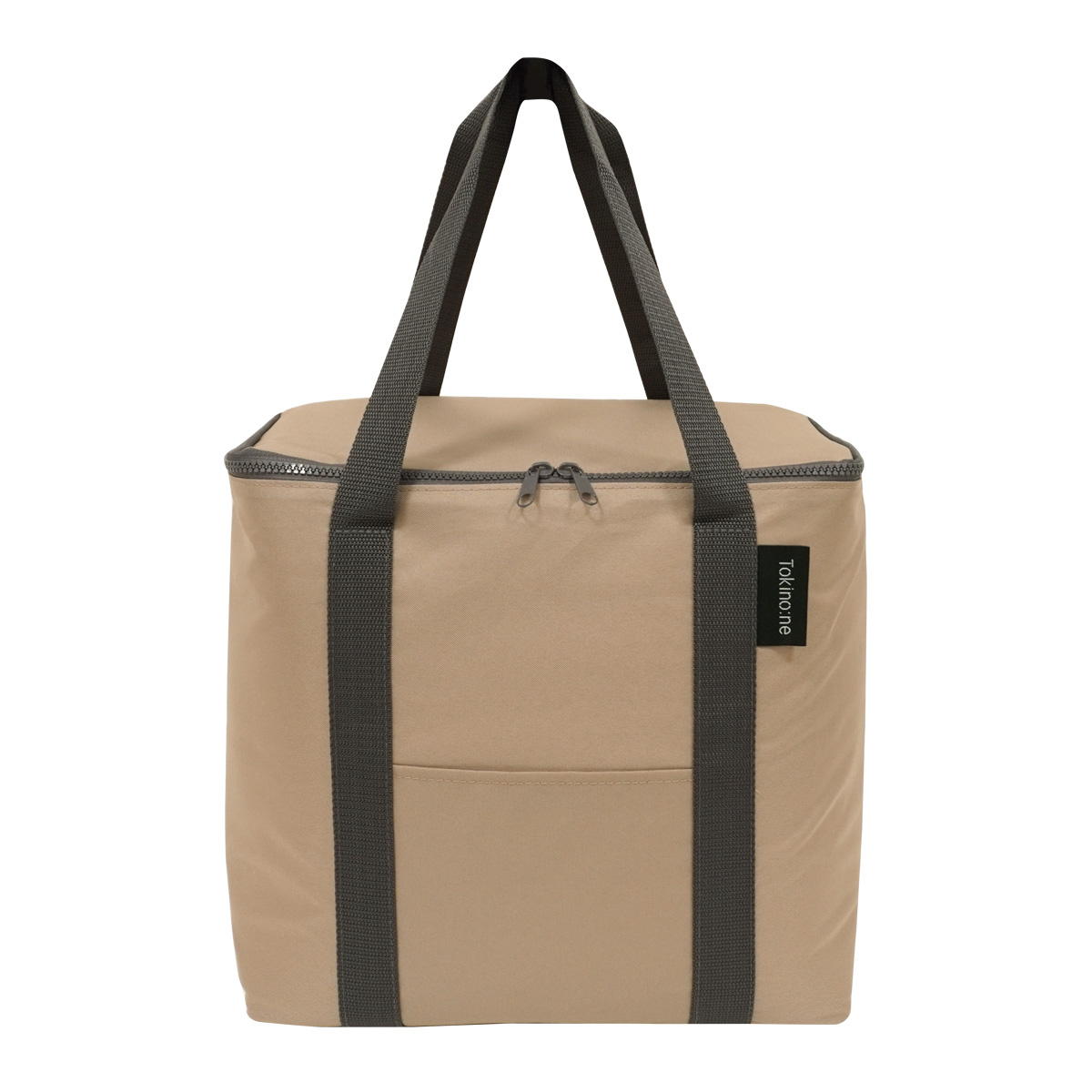 買い物やレジャーなどに使え、自転車カゴに入れやすいボックスタイプのベージュカラーの保冷トートバッグです。