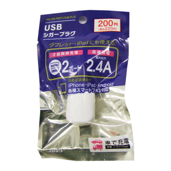 車内で充電する用のUSBシガープラグ。iPhone、iPad、Android、各種スマートフォン対応。USBポートは2つついています。カラーは、ホワイトとブラックの2種類です。ポート合計最大出力2.4Aのシガー充電器です。12V/24V入力対応なので普通車はもちろん、トラックなどの24V車にもご使用いただけます。