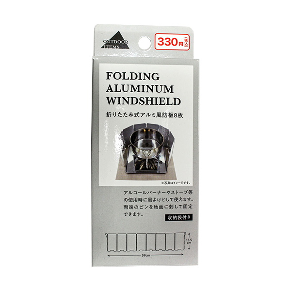 アルコールバーナーやストーブ等の使用時に風よけとして使える、キャンプなどのアウトドアで役立つ、折りたたみ式のウインドスクリーンです。固形燃料やアルコールバーナーを使うときに風避けになります。両側のピンを地面に刺す事で固定もできます。