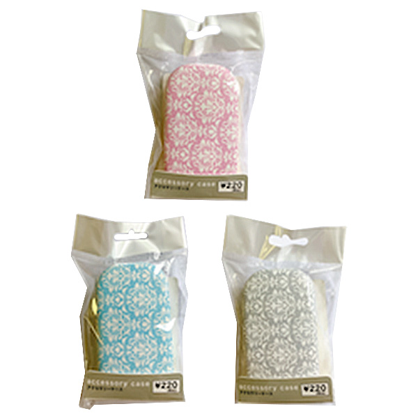 手のひらに収まる小さなアクセサリーケース。ダマスク柄。カラーはブルー、ピンク、グレーの3種類です。