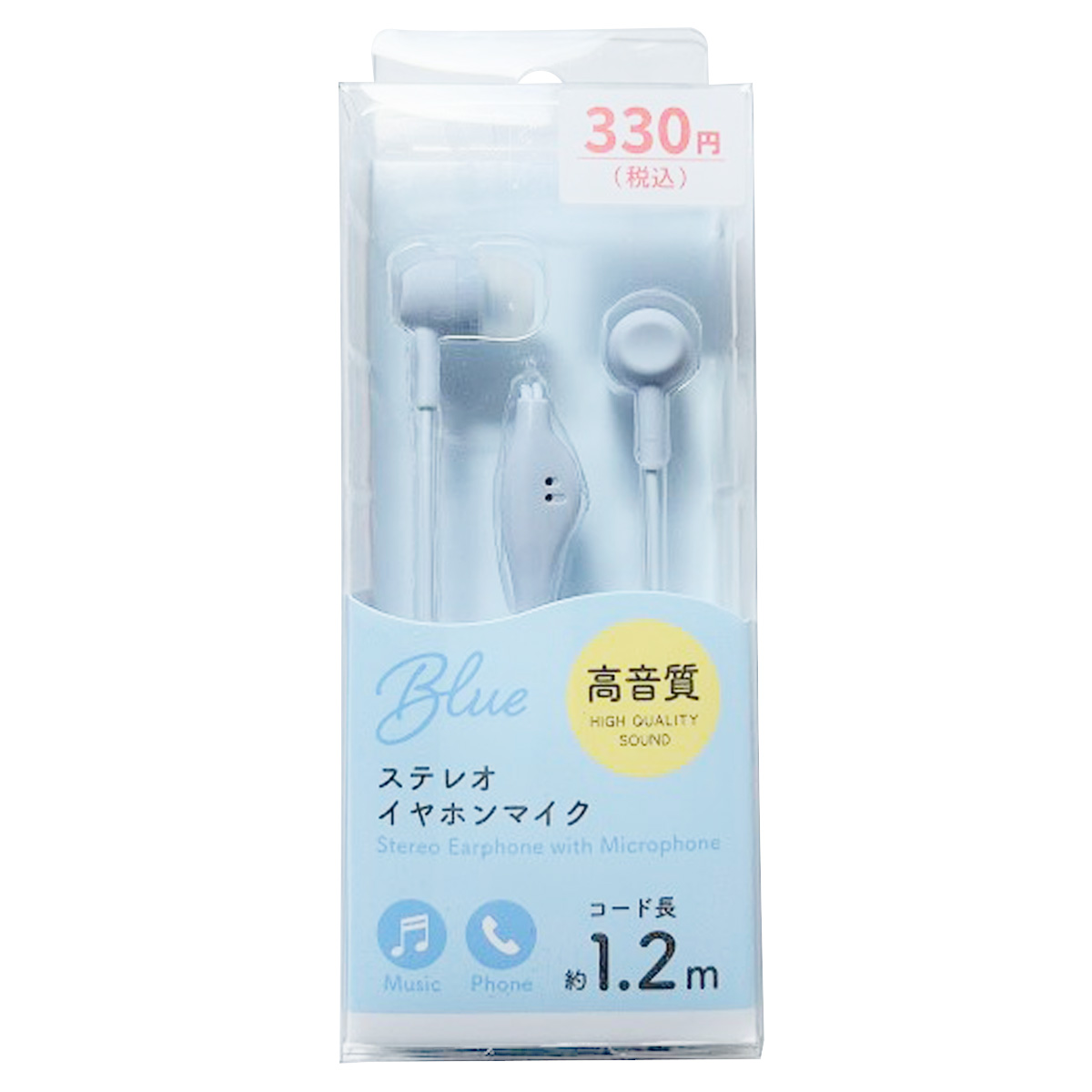 イヤホン 高音質 カナル型 マイク付 ステレオイヤホンマイク 1.2m A ブルー 358278