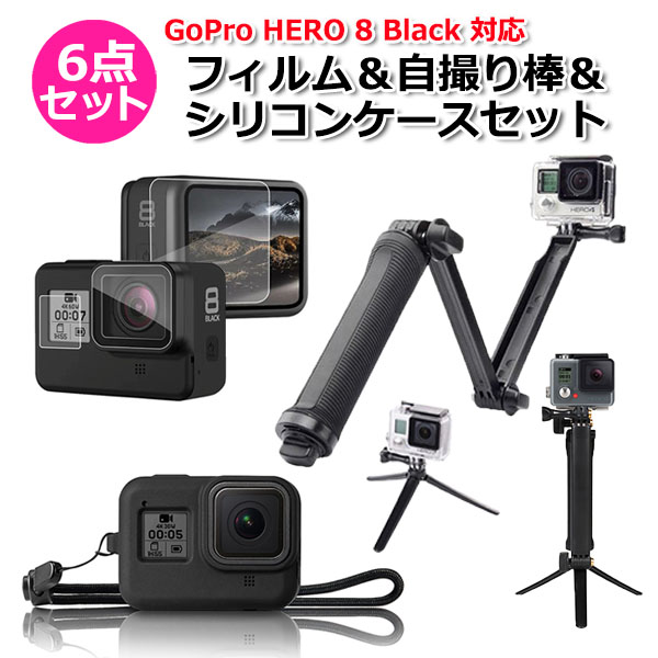 GoPro ゴープロ 8 用 アクセサリー フィルム & 自撮り棒 & シリコン ケース 6点 セット アクションカメラ ウェアラブル 送料無料