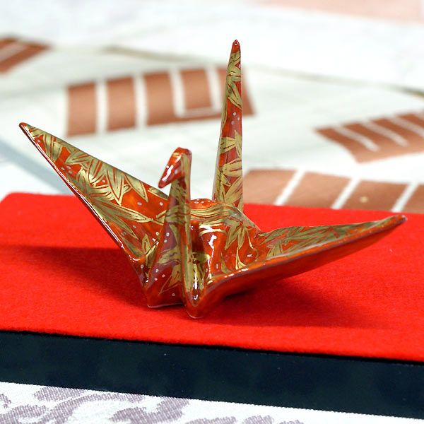 ■色絵九谷の千羽鶴 ≪NO.4≫ 九谷焼の「色絵折り鶴」で千羽鶴を製作する「九谷千羽鶴プロジェクト」。 第4作目。日本の美しい四季「秋」をイメージし金の紅葉を描いた「永楽(えいらく)」。京都の名工 永楽和全(えいらくわぜん)の影響を受けた画風です。赤の色を全面に塗り埋め、その上に金で紋様を描いた絢爛豪華な作風です。九谷ではよく、金爛手(きんらんで)と言われます。 ■2度焼きの法 九谷の「金」は通常の絵の具より焼成温度が低いため一緒に焼く事が出来ません。その為、一度焼いたあと、約100度低い温度の「金窯」で焼きます。これが九谷中興の祖、斎田道開が確立した「2度焼き」です。今でこそ当り前の方法ことですが、2度焼きが確立されなければ、絢爛豪華な九谷焼も生まれてこなかったことでしょう。過去(先人)から学び、未来へ託す、色絵九谷の千羽鶴。千羽とは長い道のりではありますが、その間に多くを学び、多くの絆を築きます。 |