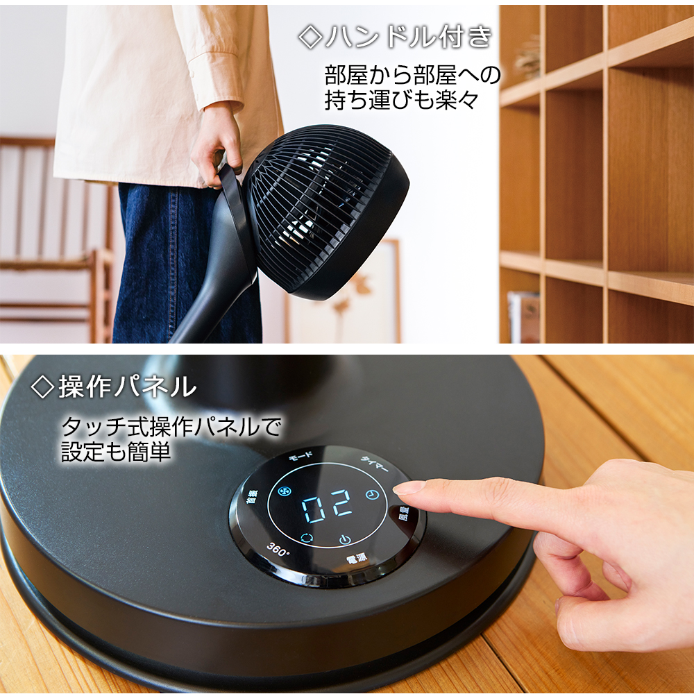 強く直進性の高い風を送るサーキュレーターの特徴と 3D首振りで広範囲に送風できる扇風機の特徴を兼ね備えた1台2役の商品で お部屋の換気とエアコンの冷暖気を効率よく循環させることができます。