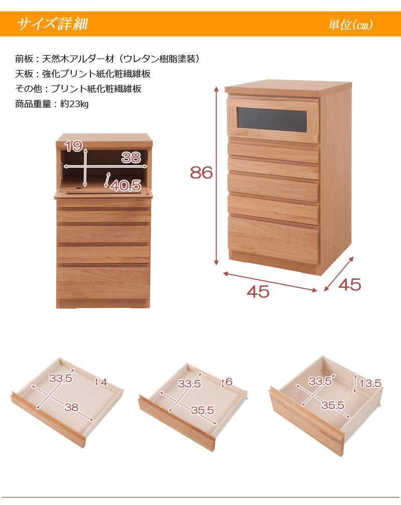 ■商品の仕様/前板:天然木アルダー材(ウレタン樹脂塗装) 天板:強化プリント紙化粧繊維板 その他:プリント紙化粧繊維板