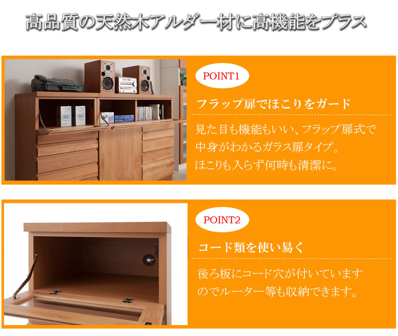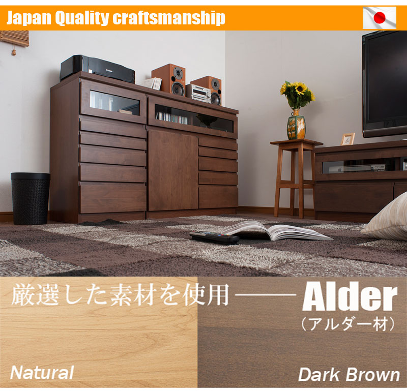 ■商品について/前面に取っ手を付けず、上部に掘り込み手掛け加工により天然木でありながらスッキリとしたデザインに仕上がっています。アルダー材特有の、美しい木目をそのまま活かしているので、、温かみがあり、かつ高級感も醸し出します。リビングを中心に充実した品揃え。天然木の温かみを是非、感じてください。FAX台としてはもちろん、窓下収納など様々なシーンで活躍します。深さの違う多段引出しで細々したものなど仕分け収納に抜群!リモコンの赤外線も受信可能なガラス付きフラップ扉にはAV機器なども収納できます。浅引出し以外はスライドレール付きで出し入れ楽々。幅90cmタイプは扉収納も付いて前面のアルダーの雰囲気抜群!同シリーズのTVボードと組み合わせて更に雰囲気UP!天然木アルダー材の質感とマッチしてお部屋に温かみと落ち着きを感じさせてくれる。天然木アルダー材の風合いはお部屋を明るく、しかも存在感があるのが特徴。シンプルなのに高級感があるアルダー材ナチュラルの家具をリビングの中心に。