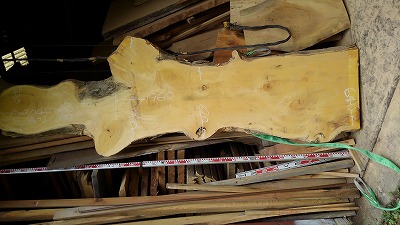 大きな節があり形も変化に富んで面白い材だと思います。お店のテーブル、カウンター天板、オブジェ、などにいかがでしょうか、