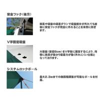特徴 | ●強化グロメット加工 負荷の掛かるグロメット部分には補強用生地芯を挟み引っ張りに強い構造を採用しております。 ●流水形状 突然の雨でも屋根に水がたまりにくい形状となっております。豪雨や雷などには十分ご注意下さい。 ●安全フック(前方) 突風や吸盤の吸着ダウンで吸盤部分が外れても前後に安全フックが完全に外れることを未然に防ぎます。 ●安全フック(後方) 突風や吸盤の吸着ダウンで吸盤部分が外れても前後に安全フックが完全に外れることを未然に防ぎます。 ●V字固定吸盤 大吸盤(直径6cm)をV字型に固定するにより、均等に負荷が掛かり吸着力が強く外れにくい仕様となっております。 ●システムロックポール 最大2.3mまでの無段階調整が可能なポールを付属。 |