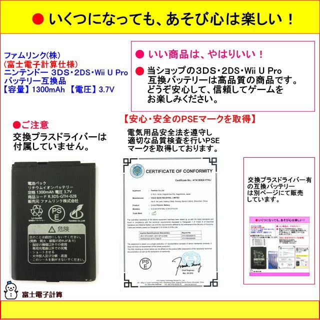 ニンテンドー 3DS・2DS・Wii U Pro コントローラー プレミアム互換バッテリー (交換ドライバー無) 互換バッテリー本体のみ