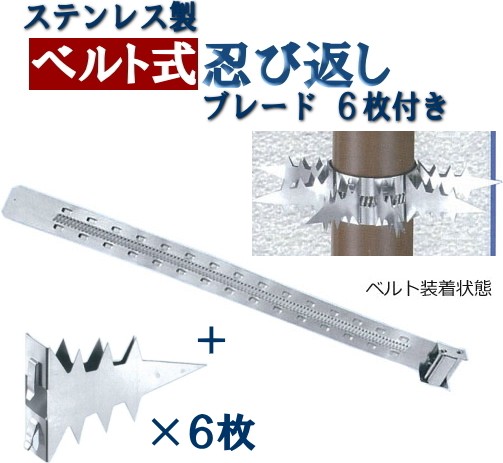 縦雨樋やパイプにフリーサイズで取り付け可能忍び返しベルト1本でφ60〜113ミリまでのパイプに取り付けが出来ます。忍び返しベルトと専用ブレード6枚付き別売で忍び返しベルトとブレードを単品販売しております。ベルト式忍び返しベルト式忍び返し専用ブレードサイズ・取付方法は別途商品画像をご参照ください
