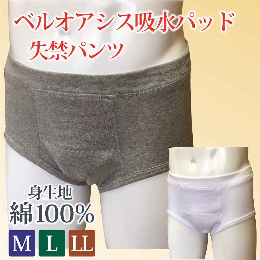 身生地綿100%の優しい着心地、尿漏れ対策用肌着 カサカサしない、柔らかな履き心地。一見普通のブリーフなので人の目を気にすることなく安心して使用できます。吸水シートには日本製テイジンベルオアシス使用。30CC対応。抗菌防臭加工で清潔・快適・安心。健康な方で軽い尿もれが気になる方にお勧めします。