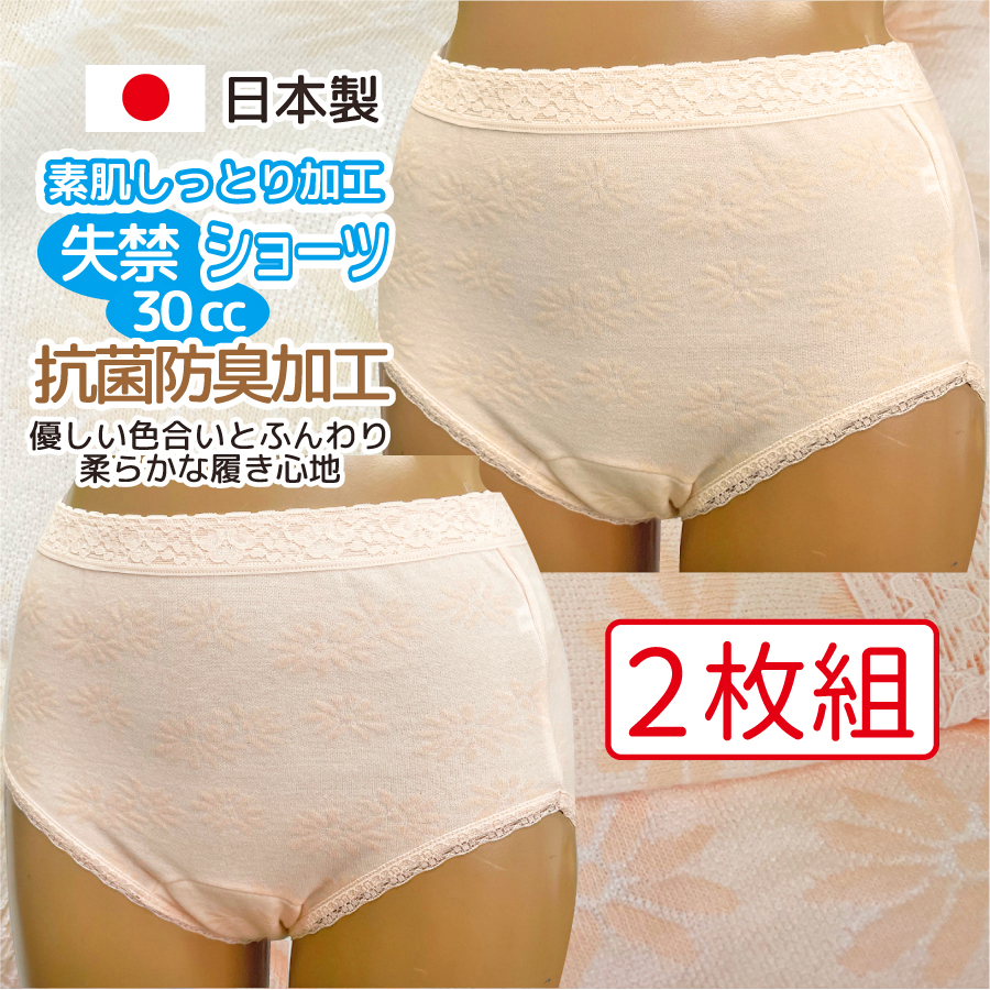 パッド部分が抗菌防臭加工の日本製尿漏れ対策肌着。ジャガード編みの柔らかく優しい着心地、伸縮性に優れ動きやすい。カサカサしない、柔らかな履き心地。30CC対応。おしゃれなレース仕様。レースの裏側は当て布付きで、直接肌に当たらない親切設計。優れた吸水性で清潔さわやか。シルクプロテイン加工でアレルギーやアトピー等お肌の弱いかたへの刺激を和らげます。1枚ではける目立たないスタイル。淡い優しい色合い。少量のうっかり漏れや頻尿、残尿が気になる方にお勧めします。
