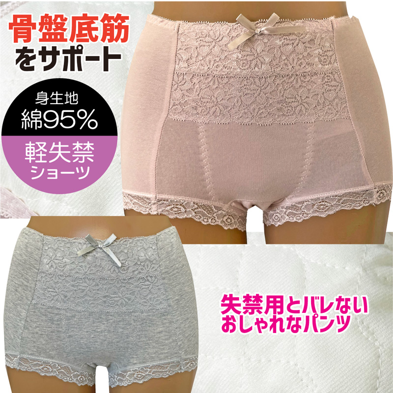 吸水パッド一体型の尿漏れ対策用肌着です。綿の優しい着心地に加え、ポリウレタン入りで伸縮性に優れ動きやすいのが特徴。カサカサしない、柔らかな履き心地。 15CC対応。おしゃれなレース仕様。前後にパワーネットを使用し、尿漏れの原因となる骨盤底筋をサポート。くしゃみをした時のうっかり漏れにも安心。健康な方で「少量のおもらしや頻尿、残尿」が気になる方にお勧めします。