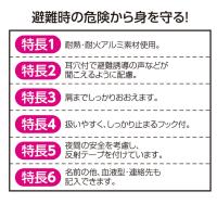 肩までしっかりガードできる防災ずきんです。避難時、外の音もよく聞こえるように耳穴が開いています。夜間の安全を考慮した反射テープ付です。名前・血液型・連絡先が記入できる欄付きです。別売の背もたれカバー(紺/JAN:4521718039800、えんじ/JAN:4521718039787、薄水色/JAN:4521718521633)に収納することで椅子に取り付けて保管することができます。