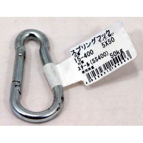 特長:開口部を押さえチェイン・ロープ等の連結に使用します。スプリングの力で開口部は戻ります。