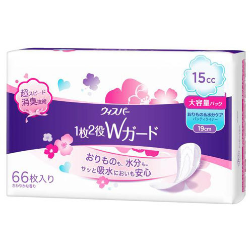■ 「ウィスパー1枚2役Wガード女性用吸水ケア15ccおりもの&水分ケアパンティライナー66枚入り19cm大容量パック」はおりものも水分も、サッと吸水しにおいも安心。