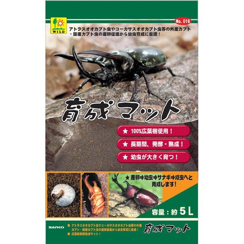 外産カブト虫(アトラス・コーカサス・ヘラクレス)から国産カブト虫の産卵から幼虫・幼虫からサナギ・サナギから成虫への育成、羽化率をUP させる為、天然広葉樹材に発酵菌を添加し、長時間、発酵熟成させたマットです。