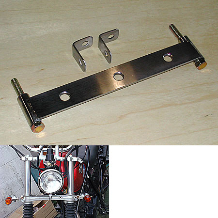 ステンレス製。フロントフォークアンダーブラケットと共締めするだけの簡単ボルトオン!ウインカーステーも付属しており、ノーマルでも社外品でも取り付けできます。(形状により取り付けできない社外品もあります)